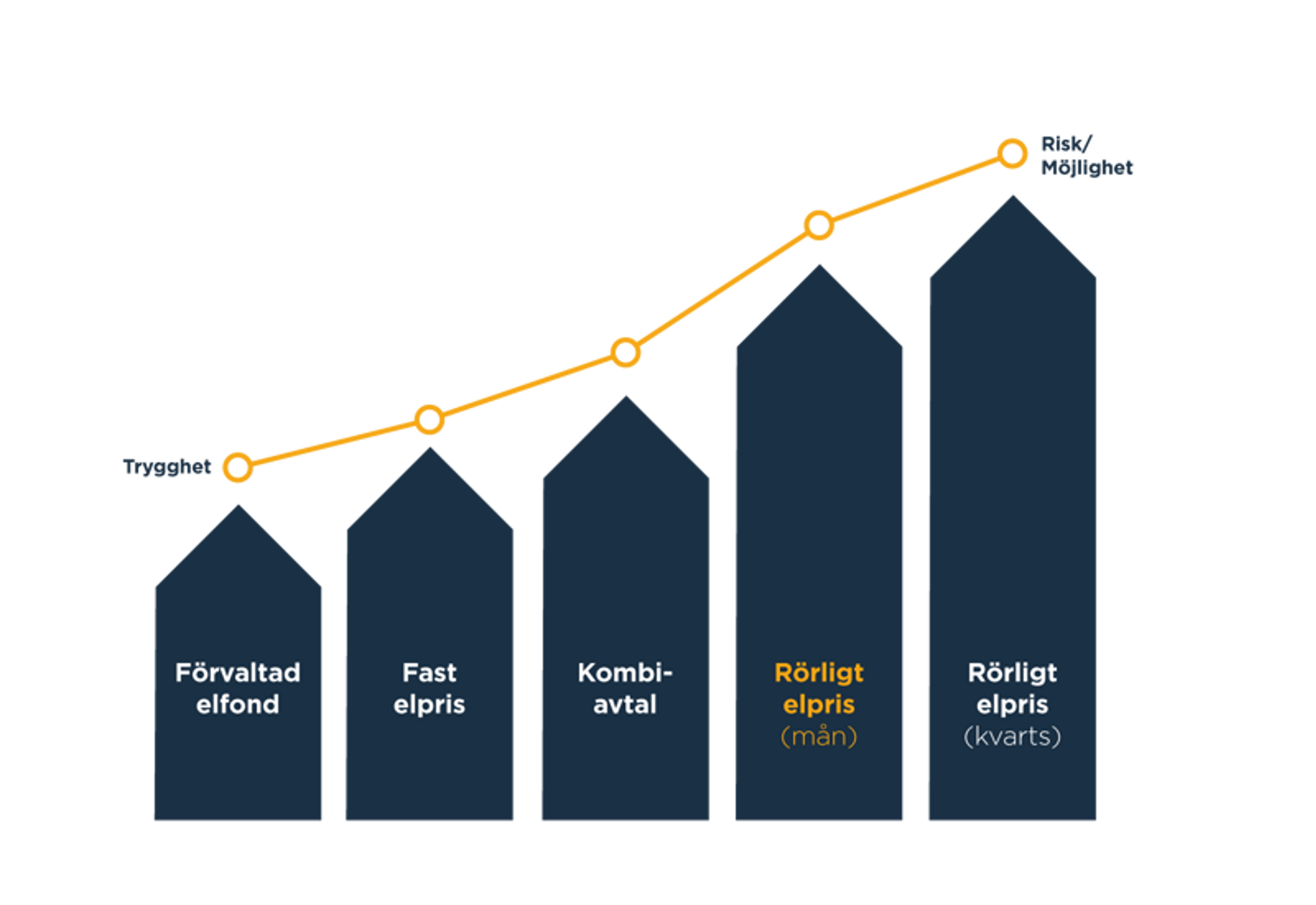 Att ha ett rörligt elavtal innebär att kostnaden för den el du använder förändras och följer elmarknadens både upp- och nedgångar. Rörligt elpris passar bra för verksamheter där elprisets påverkan på företagets produkt eller tjänst är liten. Eller verksamheter där det inte finns något behov av att mer detaljerat budgetera för elkostnader. Rörligt elpris kan vara aktuellt för såväl den lilla elförbrukande verksamheten som den med betydligt större elåtgång. För mätare med månadsavräkning sker prissättning enligt volymvägt månadsmedelspotpris och för mätare med kvartsräkning sker prissättning enligt kvartsspot.