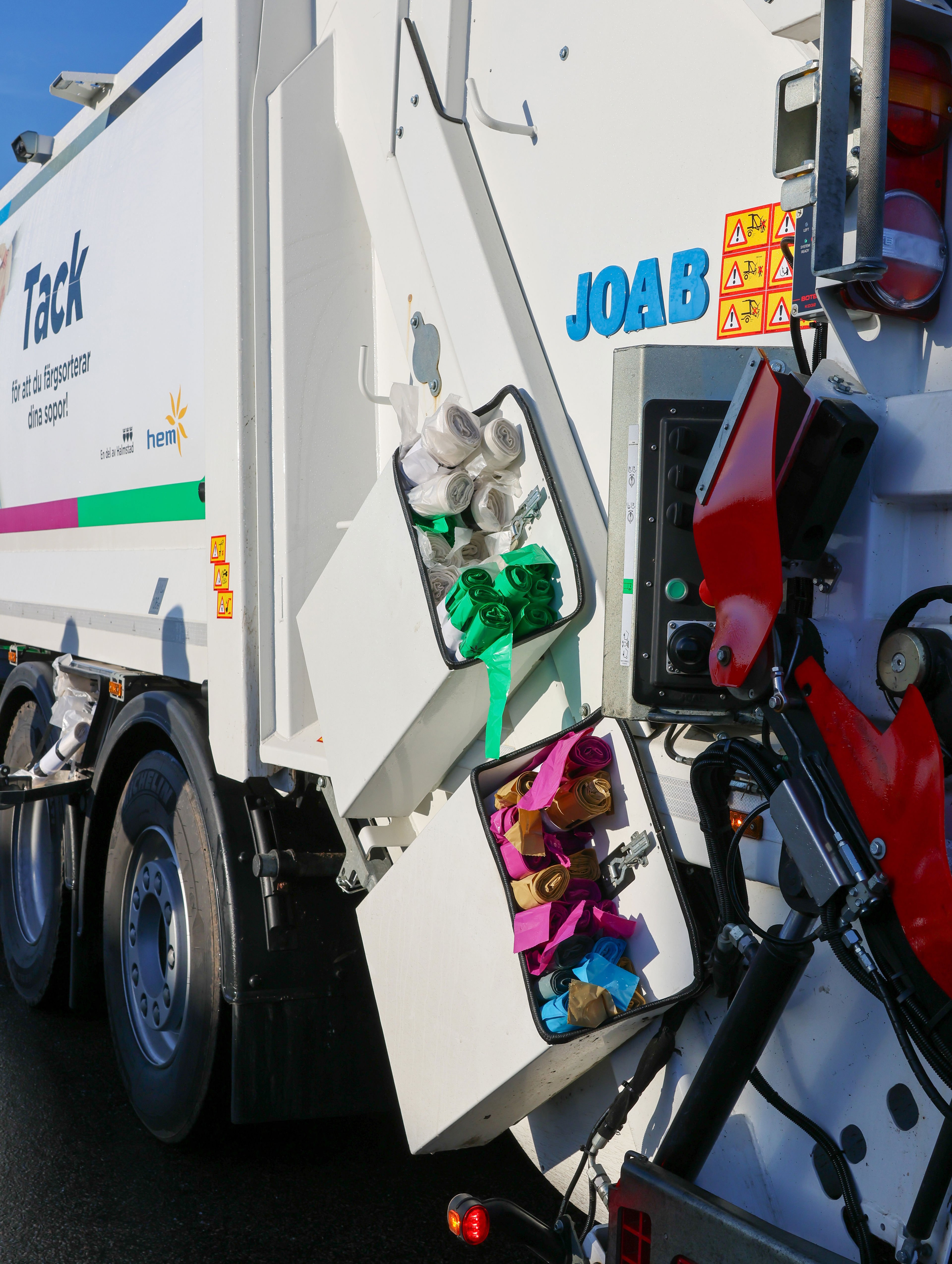 Förutom själva sophämtningen ska chaufförerna sedan HEM införde färgsortering, också lägga nya påsrullar på de soptunnor där man knutit en eller flera färgade påsar för att signalera att man behöver fler.
