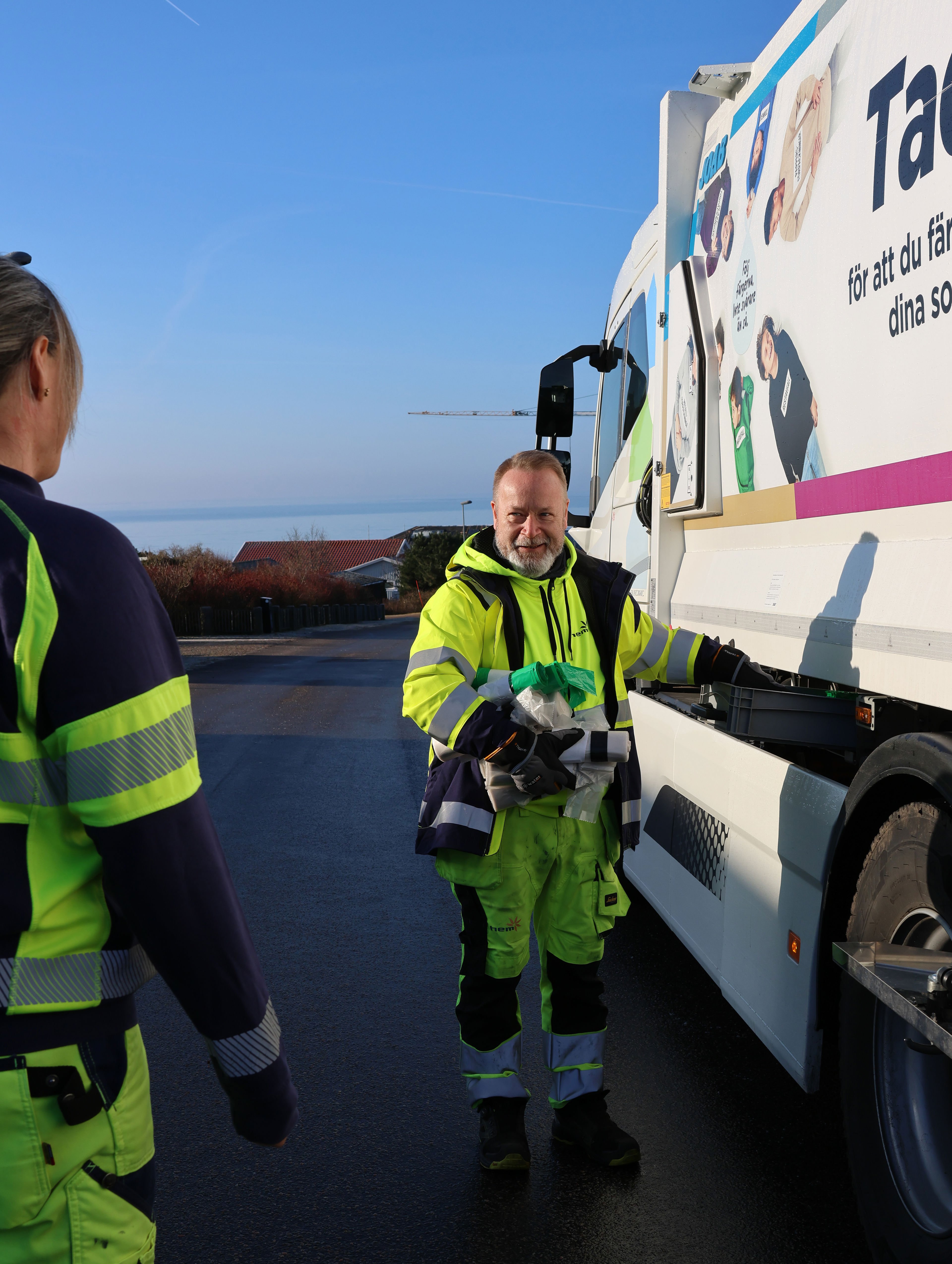 Såna här dagar refererar till den här torsdagsmorgonen på en villaväg utanför Ringenäs där vi kommit ikapp Malin och hennes kollega Kent Andersson som stannat till för att fylla på färgade förpackningspåsar och hinna få i sig sin medhavda frukost. Parkerade en bit upp i en backe är utsikten över havet i morgonsolen fantastiskt. Sämre utsikt från jobbfönstret kan man ha.